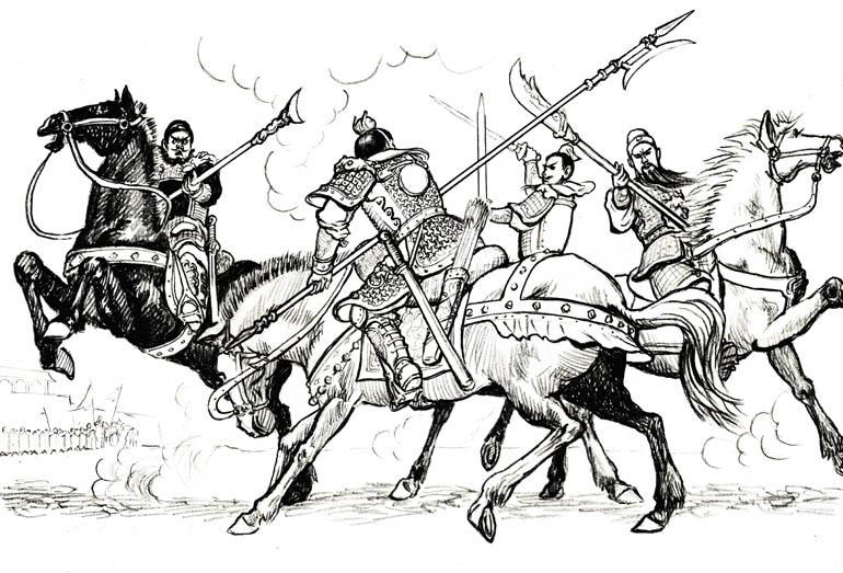 在三国演义的第五回“虎牢关三英战吕布”里,把吕布与张飞这一对冤家的首次较量描写得出神入化:“见吕布出阵:头戴三叉束发紫金冠,体挂西川红锦百花袍,身披兽面吞头连环铠,腰系勒甲玲珑狮蛮带;弓箭随身,手持画戟,坐下嘶风赤兔马:果然是‘人中吕布,马中赤兔!’”好一派英俊潇洒、威风八面的名将风度,跃然纸上。然后,是一系列精彩的战场描述:那吕布手持方天画戟在联军阵内东冲西杀、横冲直撞,见将斩将,夺营拔寨,势不可挡,如入无人之境。紧接着:“吕布复引兵搦战。八路诸侯齐出。公孙瓒挥槊亲战吕布。战不数合,瓒败走。吕布纵赤兔马赶来。那马日行千里,飞走如风。看看赶上,布举画戟望瓒后心便刺。傍边一将,圆睁环眼,倒竖虎须,挺丈八蛇矛,飞马大叫:‘三姓家奴休走!燕人张飞在此!’”