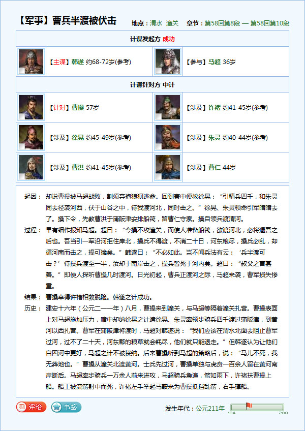 评:马超绝不是某人所说的“是个计就中”的愣头青,曹操安排如此妥当,仍然被马超小小一计“投石问路”挫败。看来与曹操的斗智中,马超也并不在明显的下风。