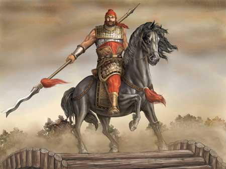 却说当年,刘备与曹操激战于长坂坡,为掩护以刘备为首的中央机关突围,张飞负责断后。曹操大军眼看将至,张飞情急之下,先是让随从的二十名军士将树枝拴在马尾上,于后面树林中来回奔跑,尘土飞扬,不辨真伪,造成大军压境的假象。然后,张飞上马,独自一人立于长坂桥上,面对气势汹汹的曹军,怒目圆睁,岿然不动。见曹军不敢上前,张飞三声大喝,一次比一次摄人魂魄,以至于最后一声大喊,将曹操身边夏侯霸震得肝胆俱裂,口吐胆汁,死于马下。